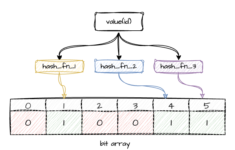 A Bloom filter is a probabilistic data structure that makes it possible to check whether an element is not present in a dataset. If the Bloom filter returns 0 for an element, it is definitely absent. If it returns 1, the element may be present — or this may be the result of a hash collision. The main goal is to reduce the probability of false positives and minimize memory lookups during checks.